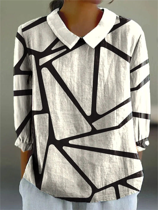 Biała, nieregularna, geometryczna, bawełniana i lniana koszula damska z nadrukiem