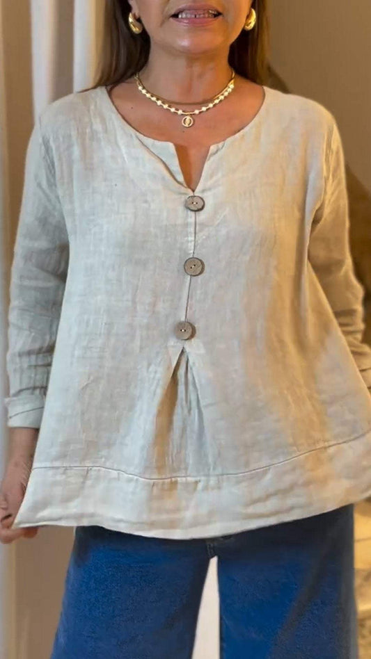Luźna i wygodna beżowa koszula z bawełny i lnu z okrągłym dekoltem i guzikami