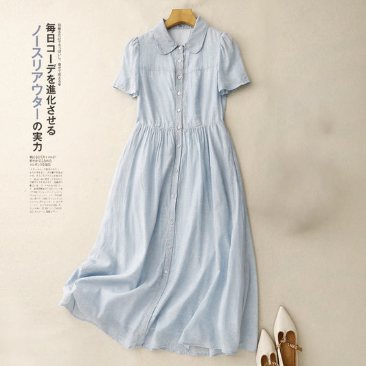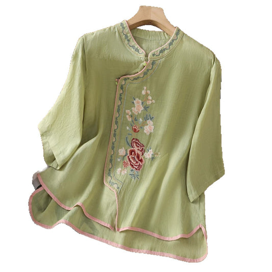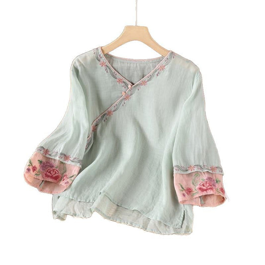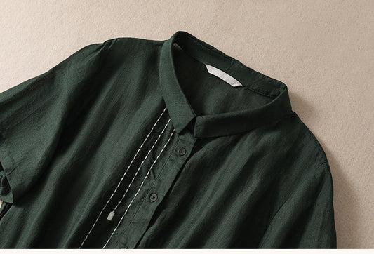 Jednolity kolor bawełny i lnu z wykwintnym haftem i koszulą z rękawem do połowy długości