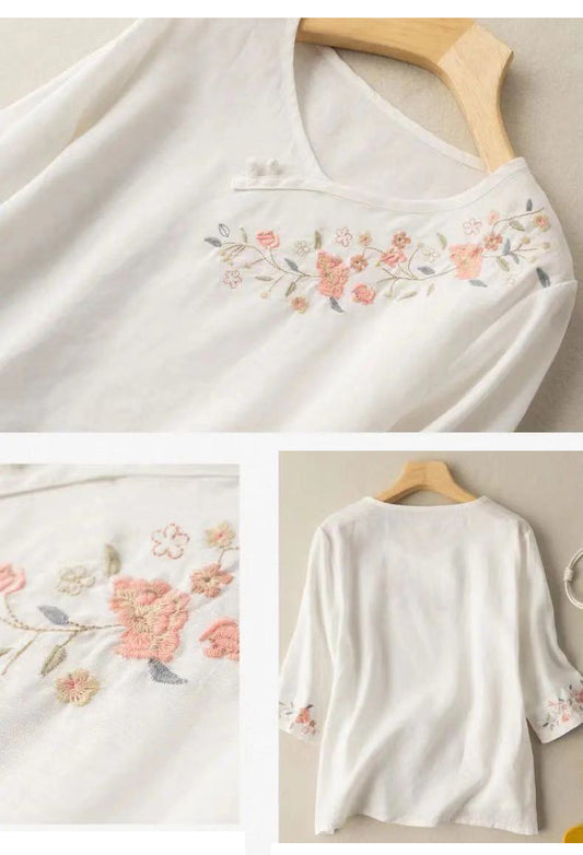Koszula z bawełny i lnu z delikatnym haftem kwiatowym, rękawami średniej długości i kołnierzykiem zapinanym na guziki