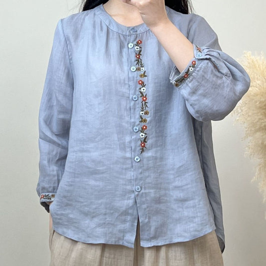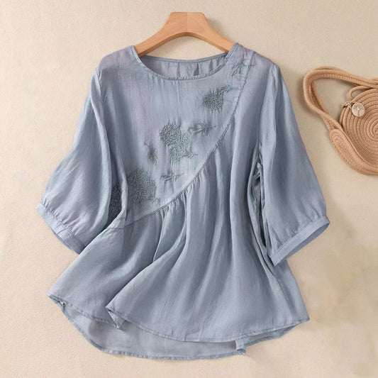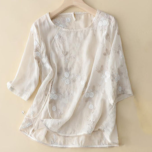 Elegancka koszula w stylu vintage z okrągłym dekoltem i haftowanymi kwiatami