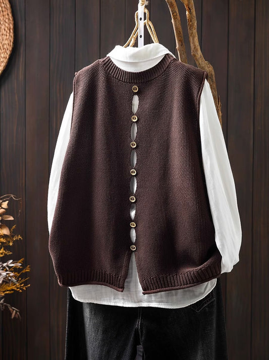 Ten luźny, uniwersalny sweter bez rękawów wyróżnia się nowatorskim krojem i zapięciem na guziki z tyłu.