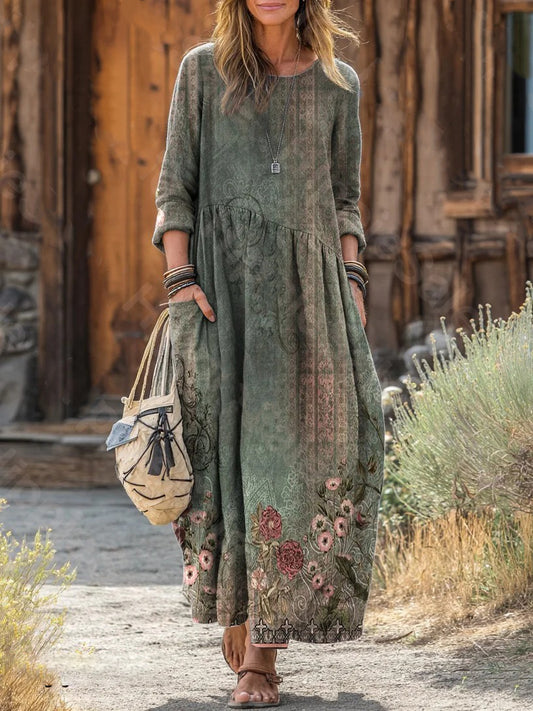 Elegancka i wygodna bawełniana sukienka w kolorze niebiesko-szarym z kwiatowym nadrukiem, długimi rękawami i kieszeniami bocznymi.