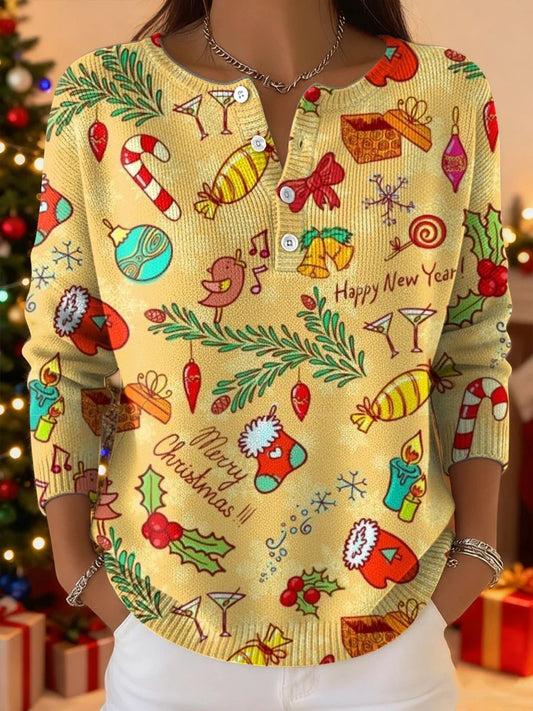 Elegancki i wygodny żółty sweterek, ozdobiony ładnym nadrukiem przedstawiającym świąteczne prezenty, z półotwartym dekoltem.