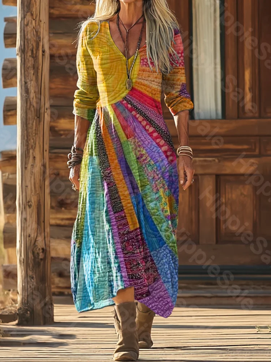 Elegancka i wygodna, wielokolorowa sukienka z dekoltem w serek.