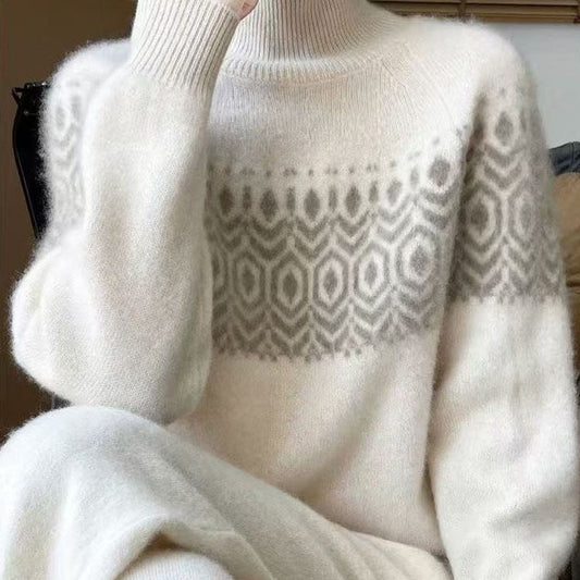 Elegancki i wygodny sweter z golfem, miękki i ciepły, z geometrycznym wzorem żakardowym.