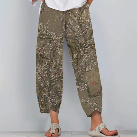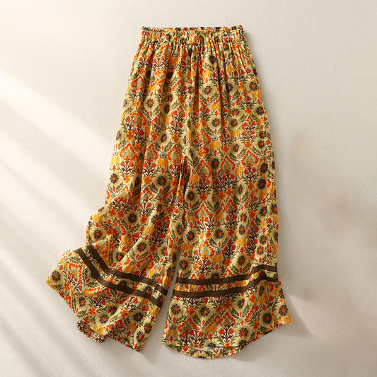 Cienkie, bawełniane i lniane spodnie z wysokim stanem i szerokimi nogawkami z nadrukiem w stylu retro