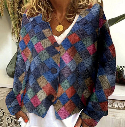 Elegancki i wygodny brązowy kardigan w nieregularny geometryczny wzór