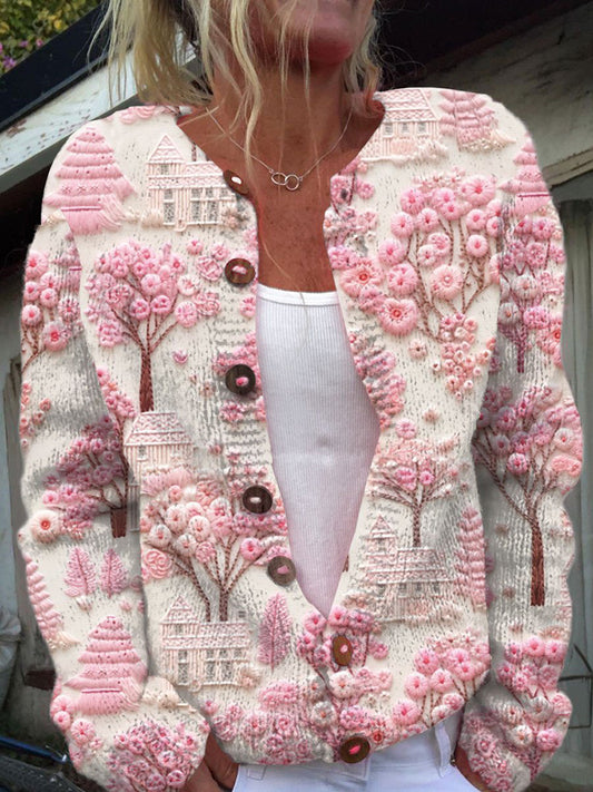 Elegancki sweterek w różowy kwiatowy wzór w stylu retro