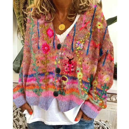 Elegancki i wygodny sweterek z ładnym kwiatowym wzorem i guzikami przy dekolcie