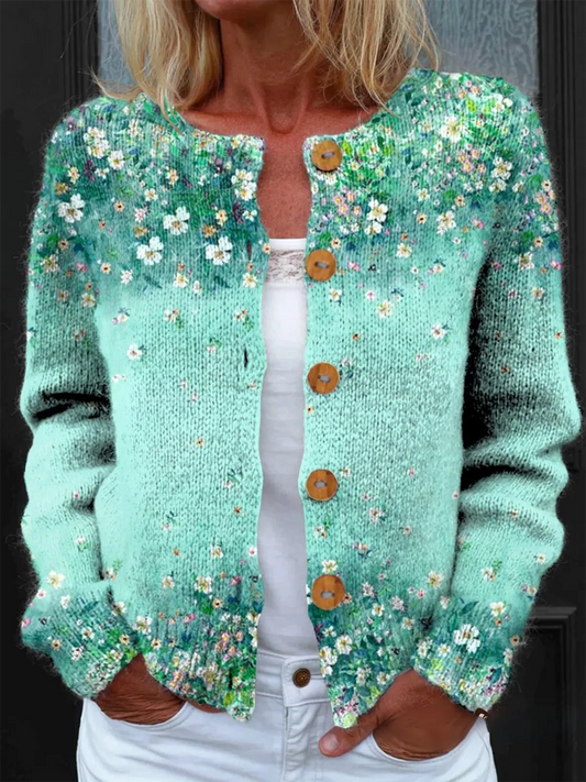 Elegancki i wygodny zielony kardigan ombre z uroczym, drobnym wzorem kwiatowym