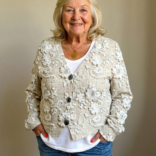 Elegancki i wygodny, pluszowy kardigan w kolorze khaki z białym wytłoczonym wzorem kwiatowym