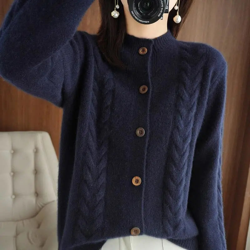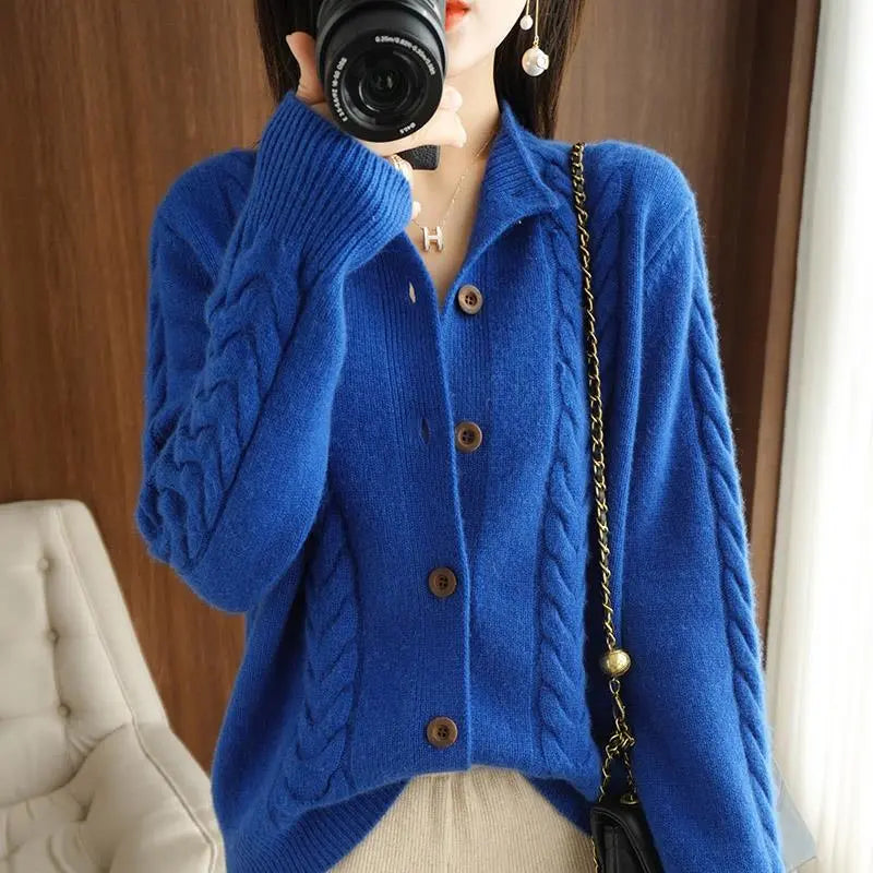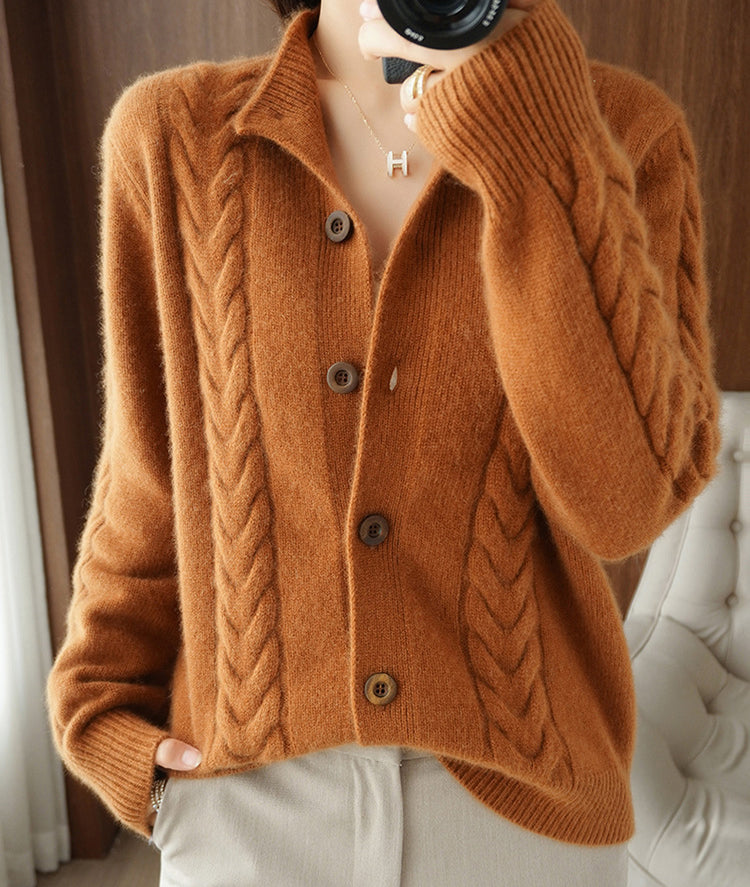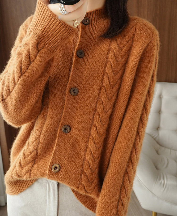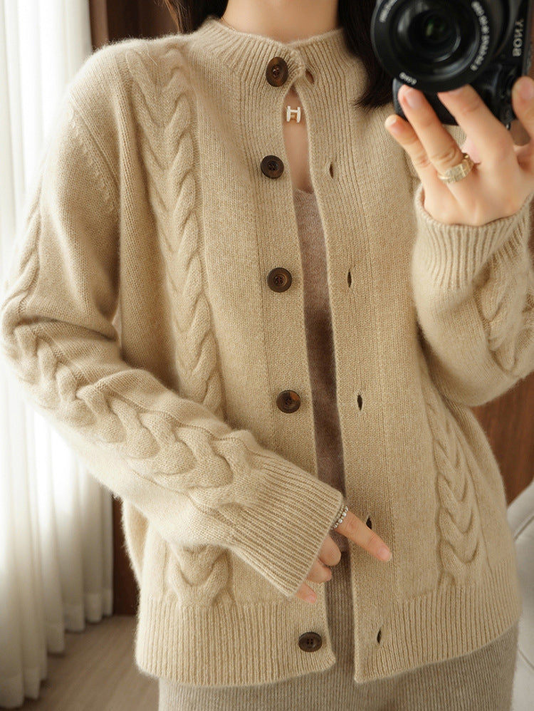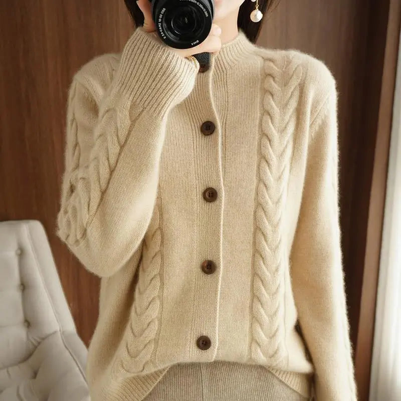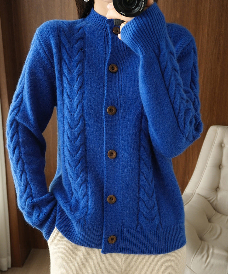 Damski kardigan dzianinowy o wyrafinowanym i uroczym splocie oraz wzorze splotu kablowego