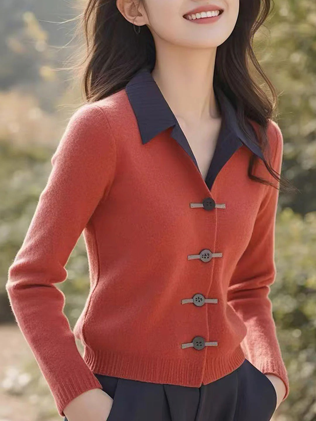 Dopasowany, luksusowy damski kardigan dzianinowy zapinany na jeden guzik. 02