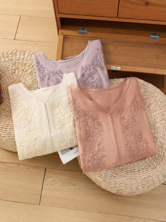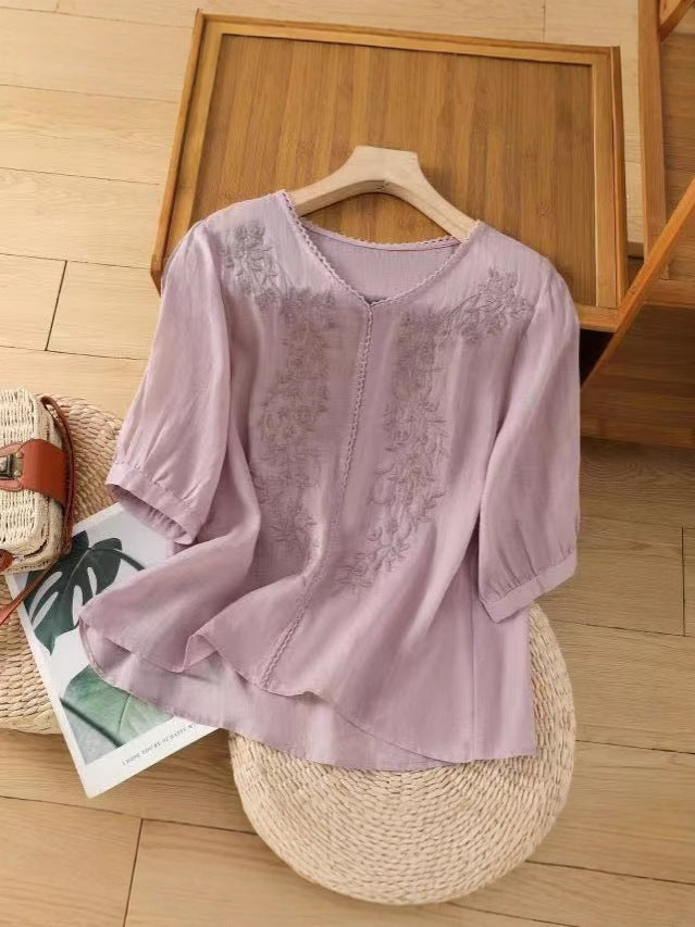 Elegancka i wygodna koszula w stylu retro z krótkim rękawem i dekoltem w serek, ozdobiona kwiatowym wzorem.