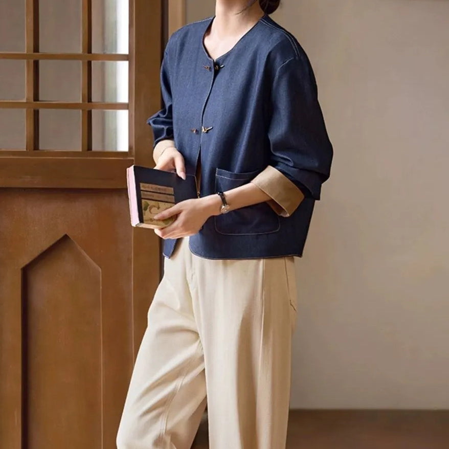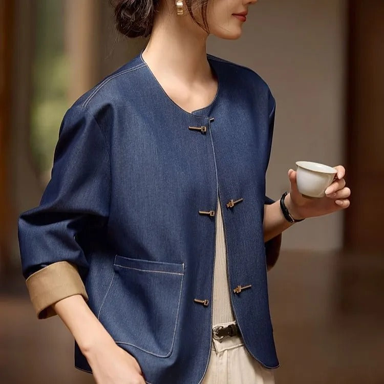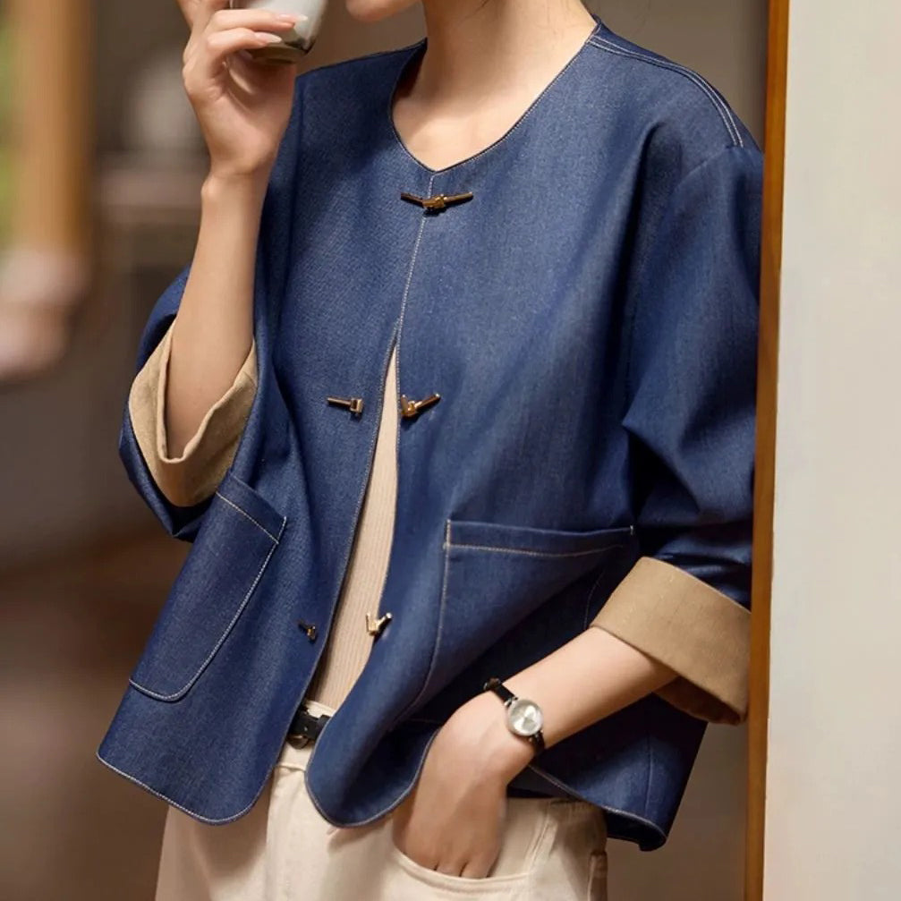 Metalowe guziki łączą elementy tradycyjne i nowoczesne, tworząc prostą i elegancką koncepcję artystyczną.