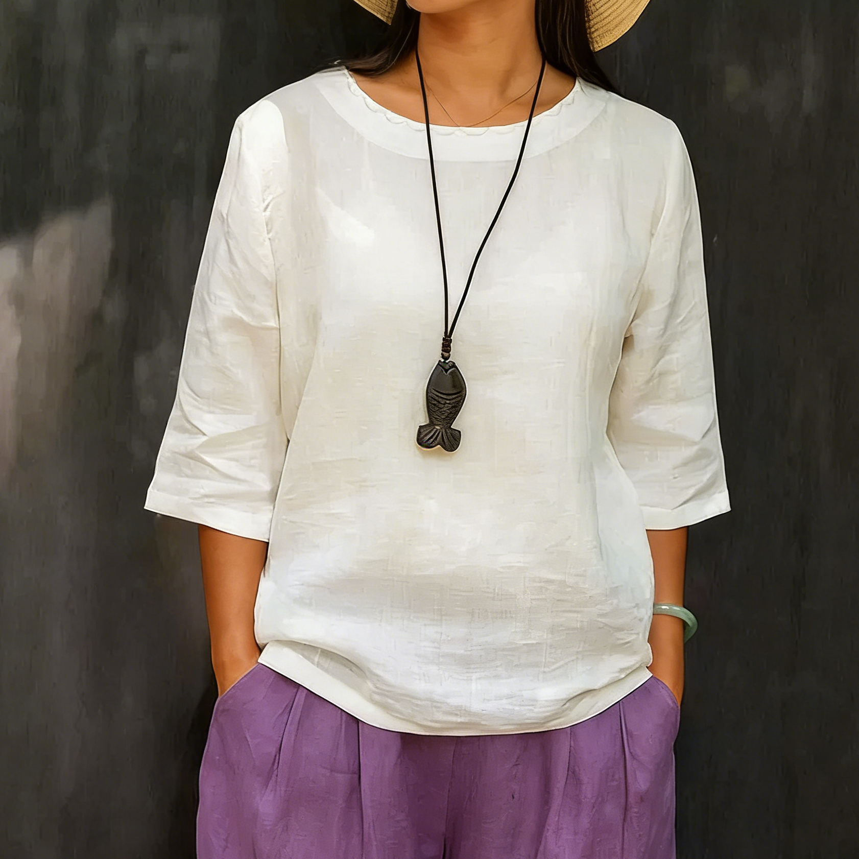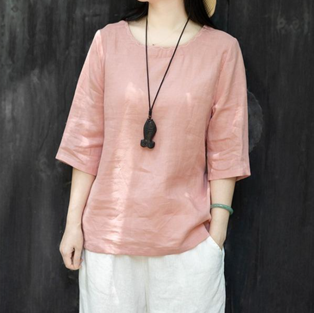 Elegancka, luźna i wygodna koszula z krótkim rękawem i okrągłym dekoltem w jednolitym kolorze