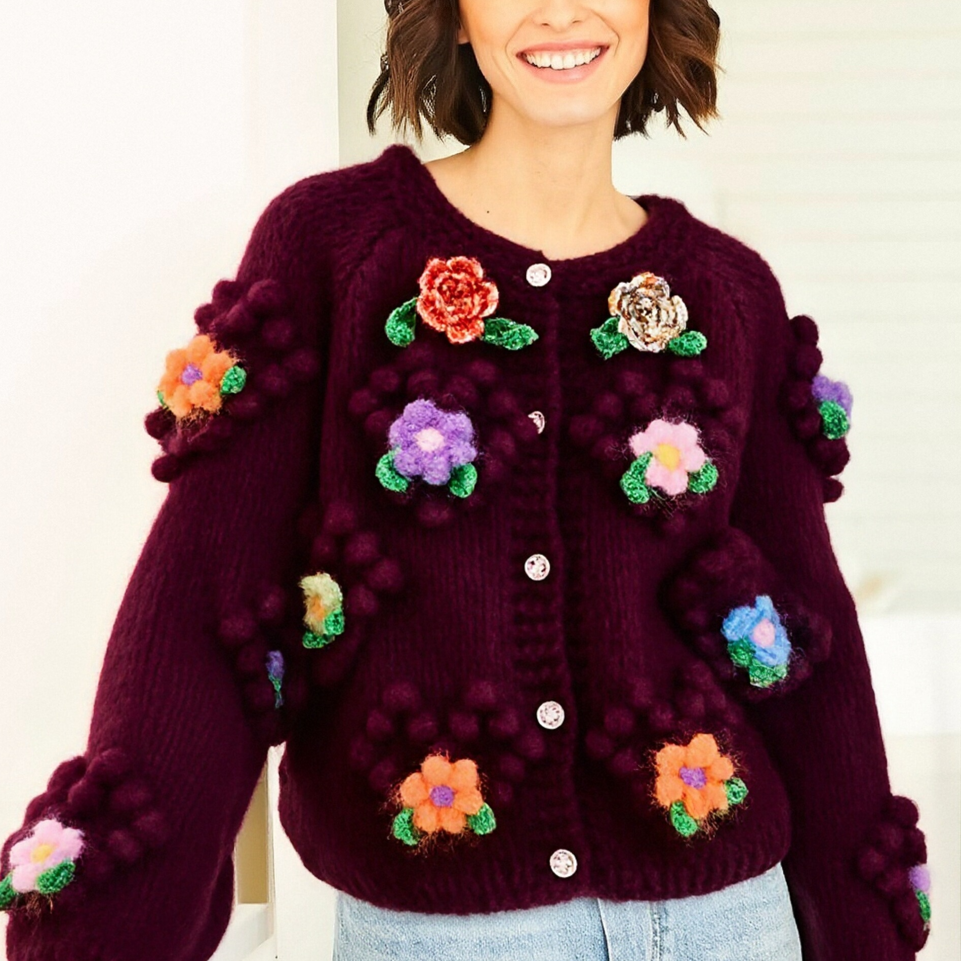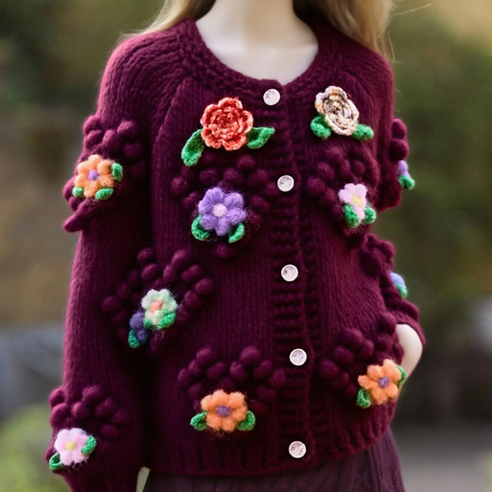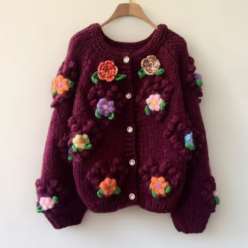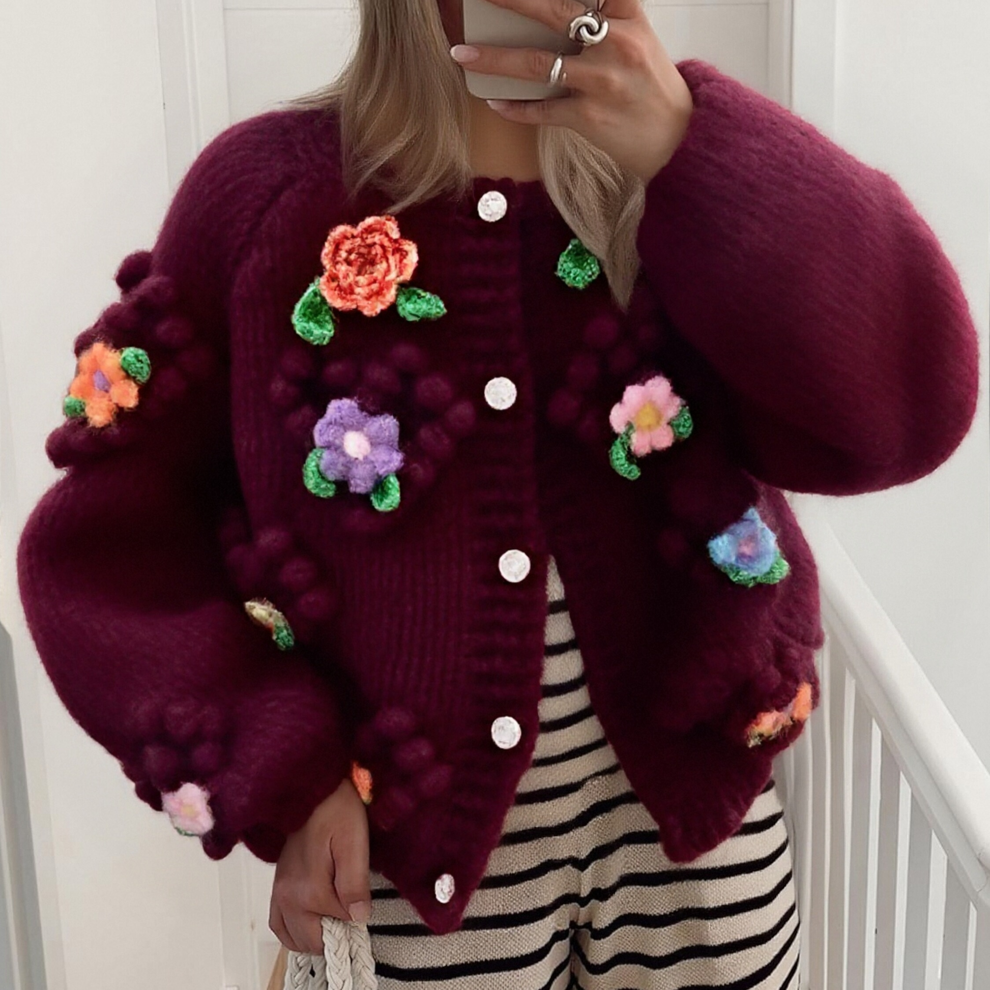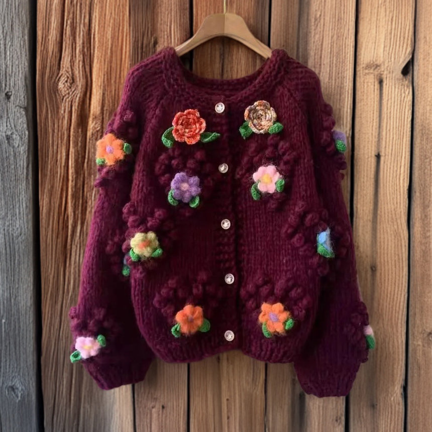 Elegancki i retro kardigan w kolorze szkarłatnym z trójwymiarowym wzorem kwiatowym i luźnym, swobodnym krojem