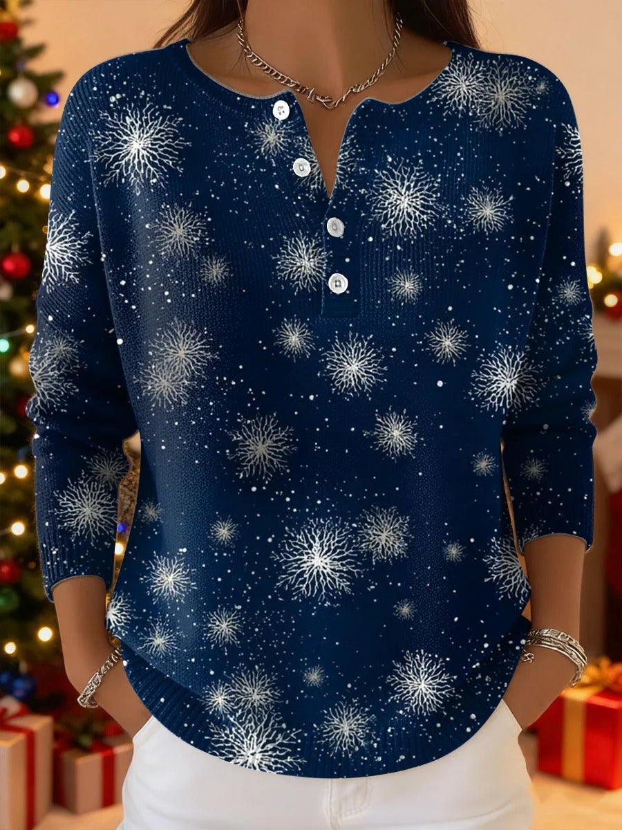 Elegancki i wygodny, ciemnoniebieski sweter z białym wzorem w gwiazdy i półotwartym kołnierzykiem.
