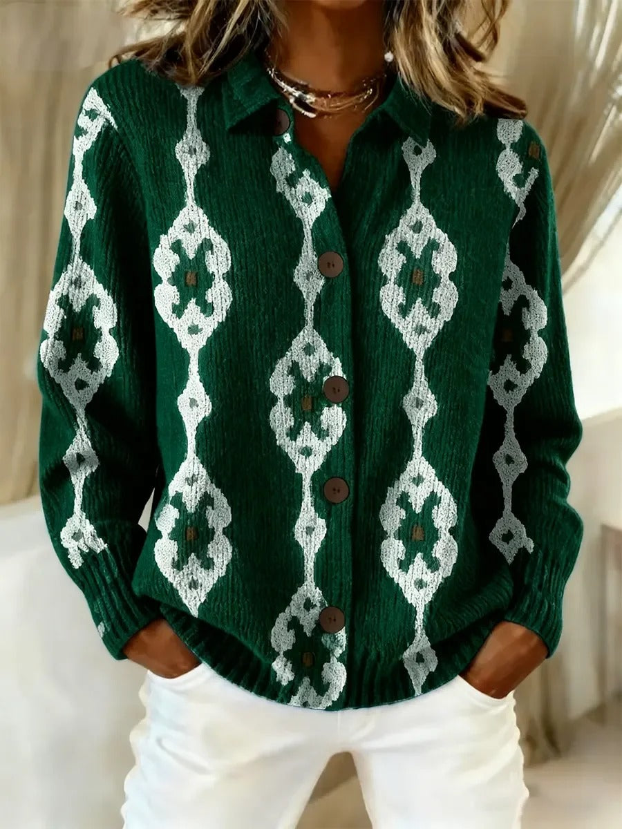 Elegancki i wygodny, ciemnozielony kardigan ze wzorem w kwiaty w kształcie diamentów i ozdobnymi guzikami.