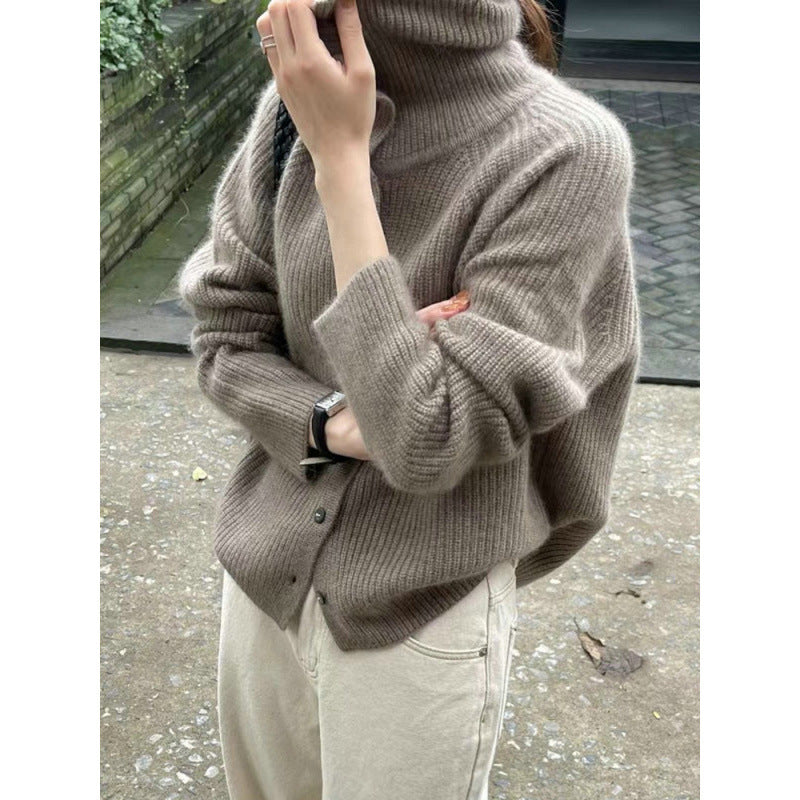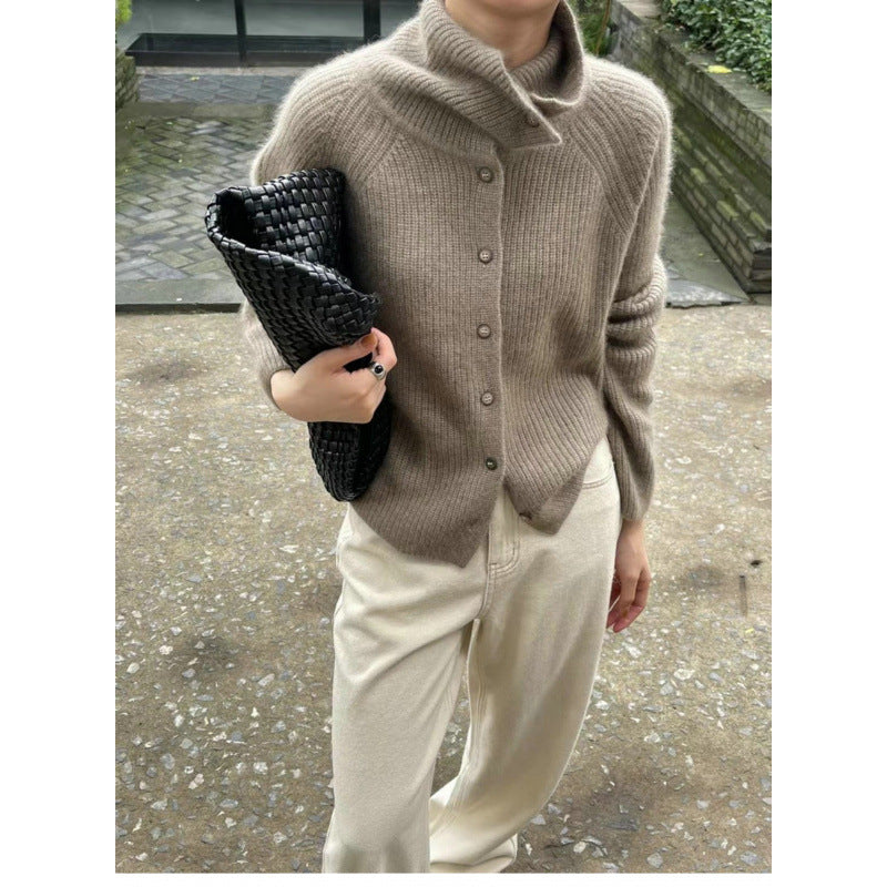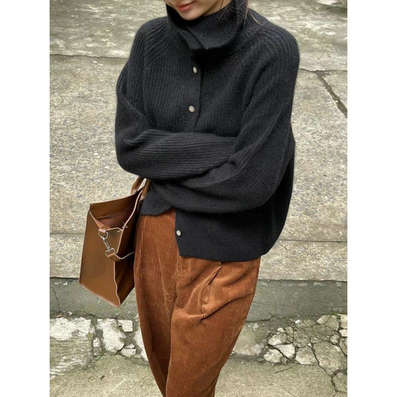 Elegancki i wygodny, dzianinowy kardigan z wysokim kołnierzem, w jednolitym kolorze, o uniwersalnym stylu 02