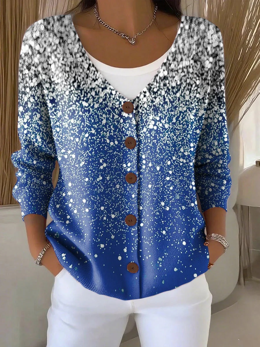 Elegancki i wygodny kardigan z wełny w odcieniu niebieskiego gradientu, odpowiedni do noszenia na co dzień