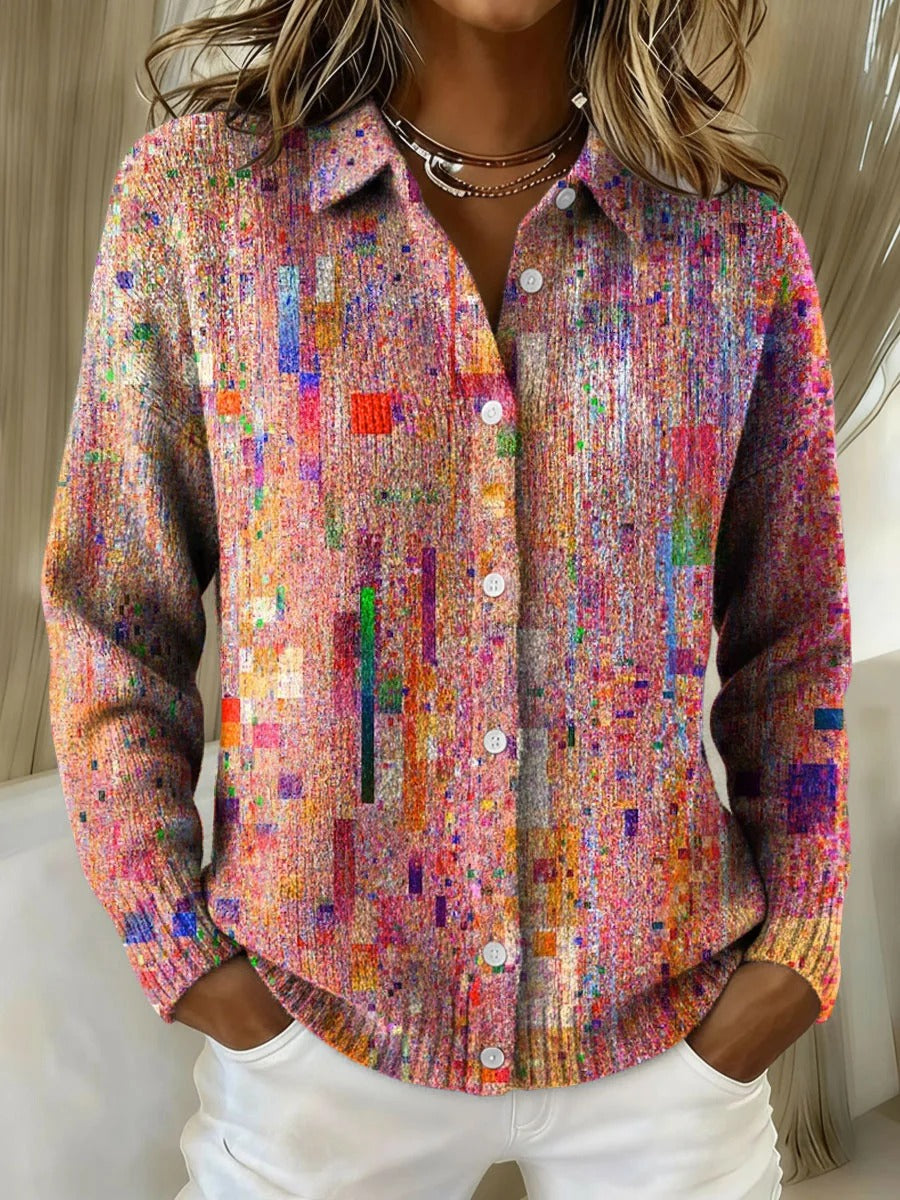 Elegancki i wygodny różowy kardigan, ozdobiony nieregularnymi, kolorowymi wzorami geometrycznymi i ozdobnymi guzikami.