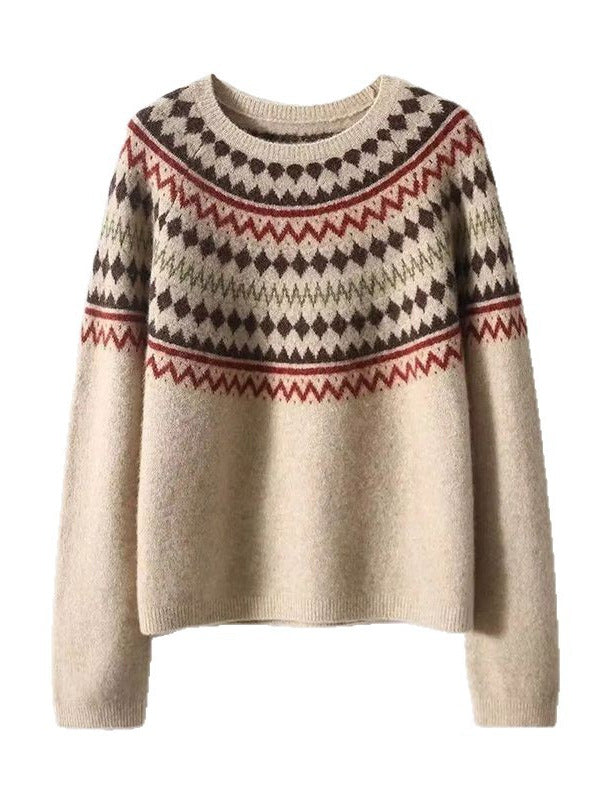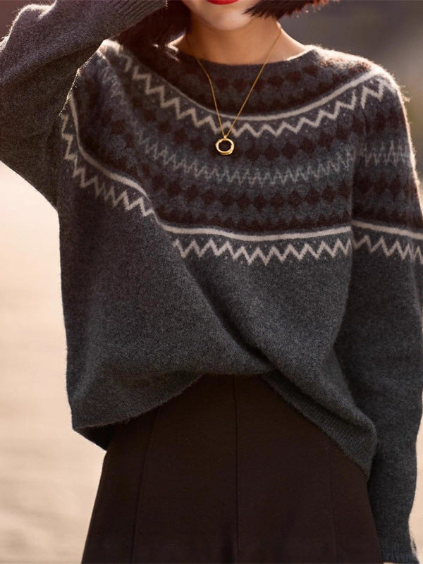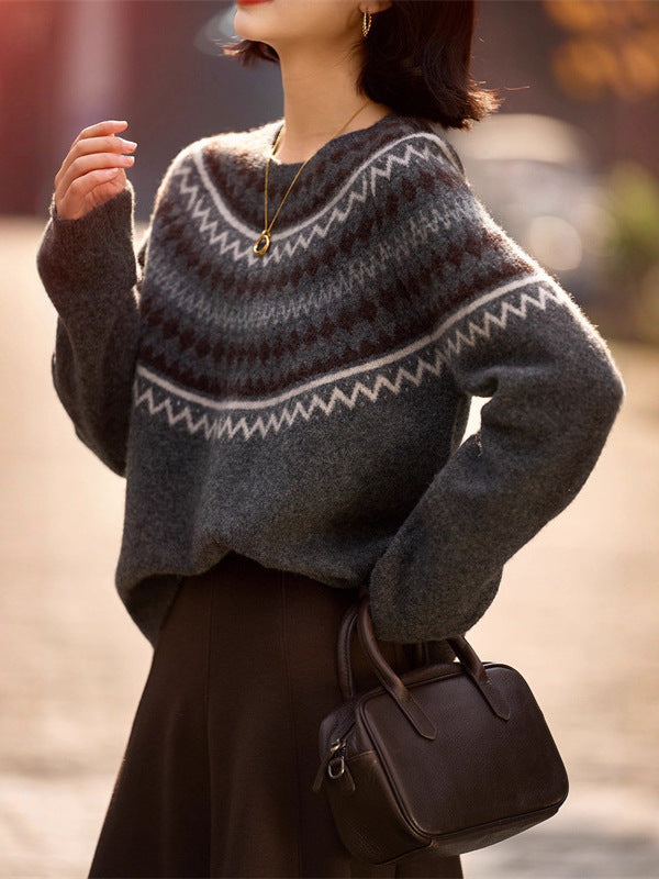 Elegancki i wygodny wełniany sweter z falistym kwiatowym wzorem i okrągłym dekoltem, dostępny w dwóch kolorach.