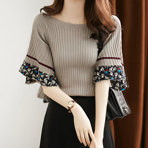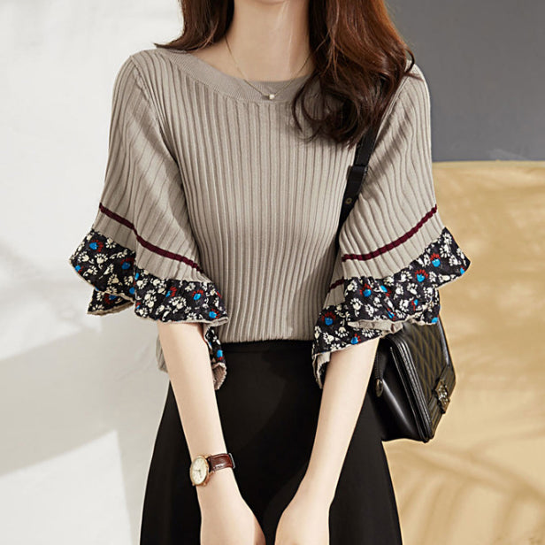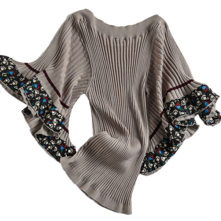 Luksusowy, nowy sweter w stylu retro z szerokimi mankietami ozdobionymi kwiatowymi wzorami.
