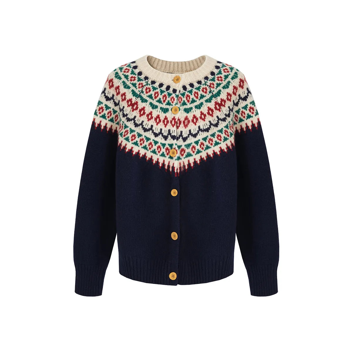 Luźny i wygodny niebieski kardigan z geometrycznym wzorem w stylu retro i zapięciem na guziki