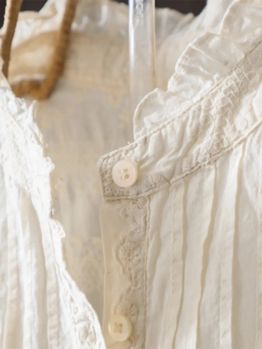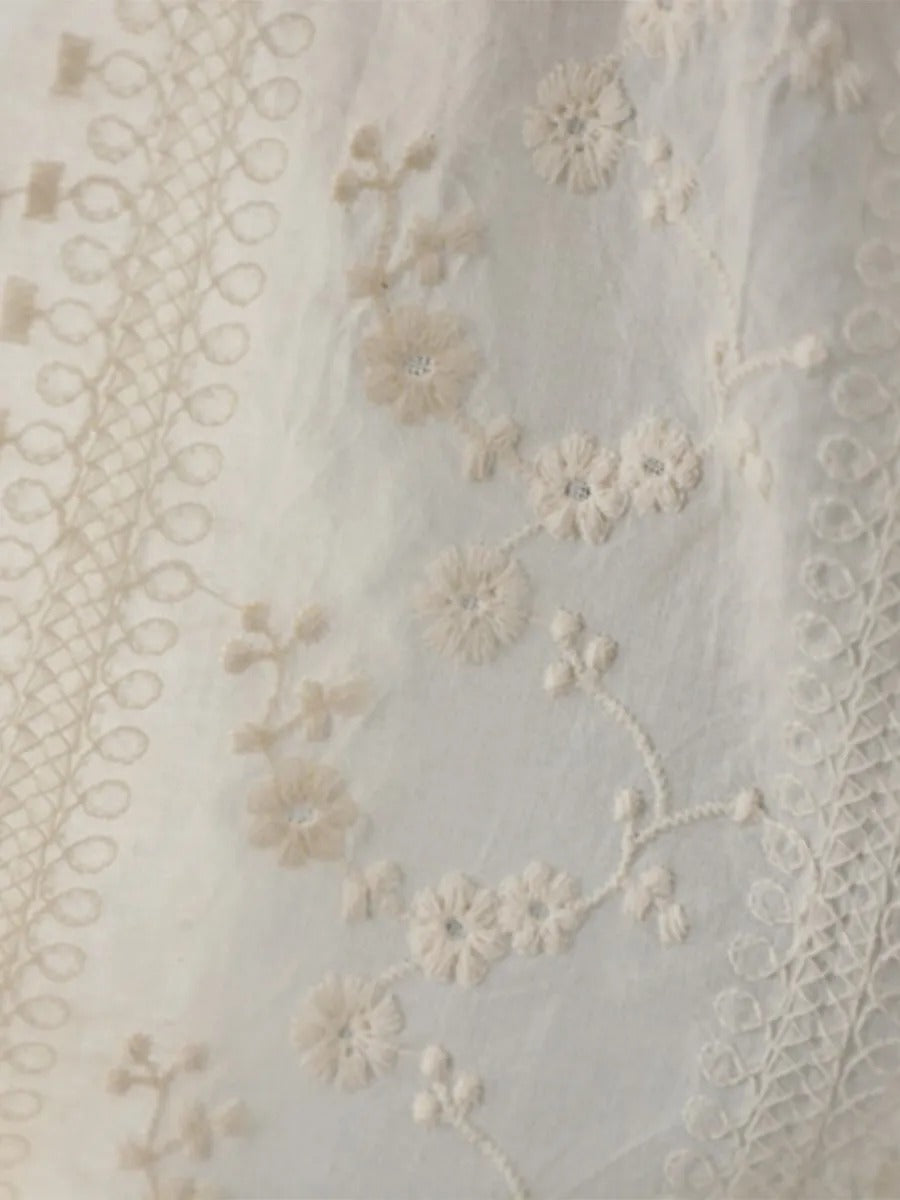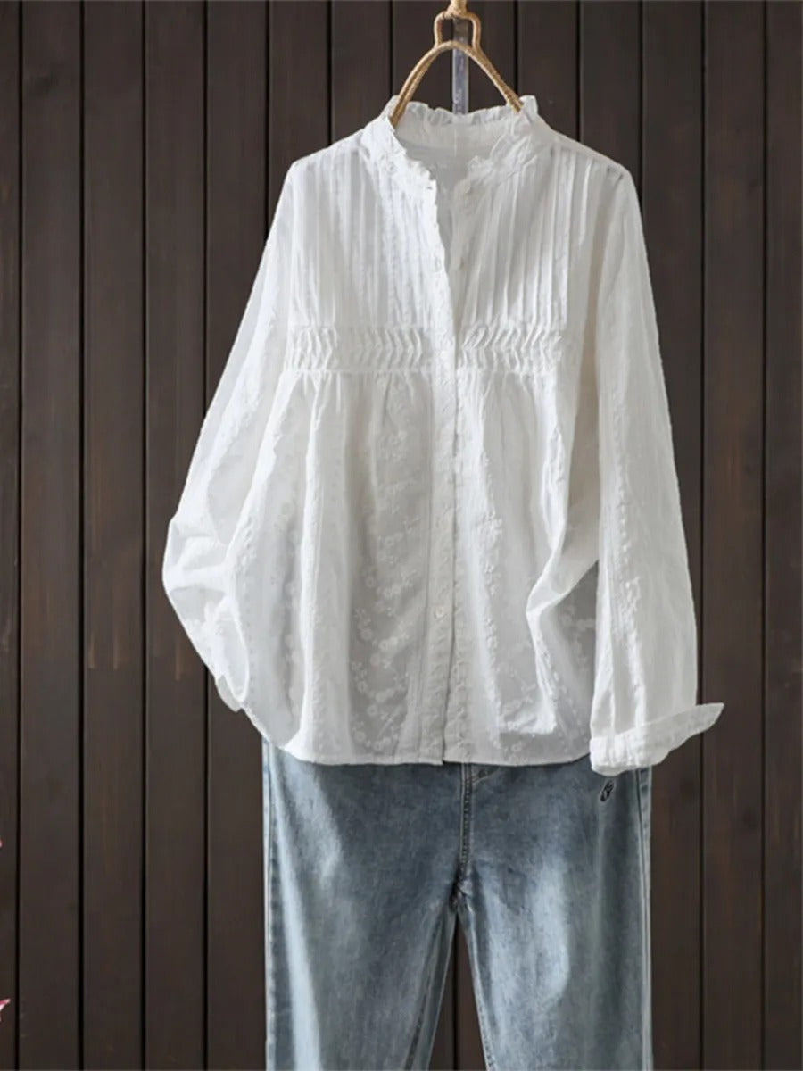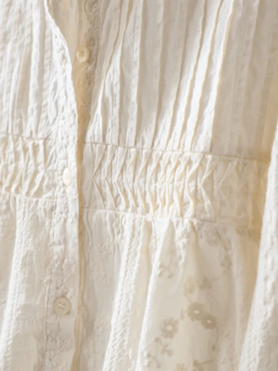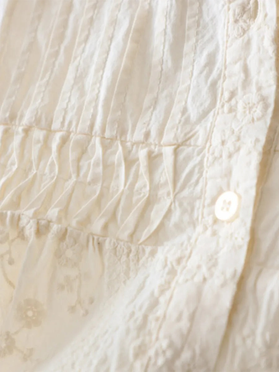 Nowa, luźna koszula w stylu francuskim z zakładkami harmonijkowymi, wykonana z czystej bawełny i ozdobiona haftowanym wzorem kwiatowym.