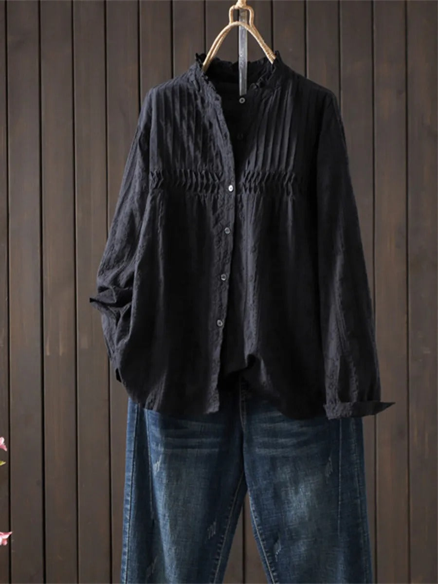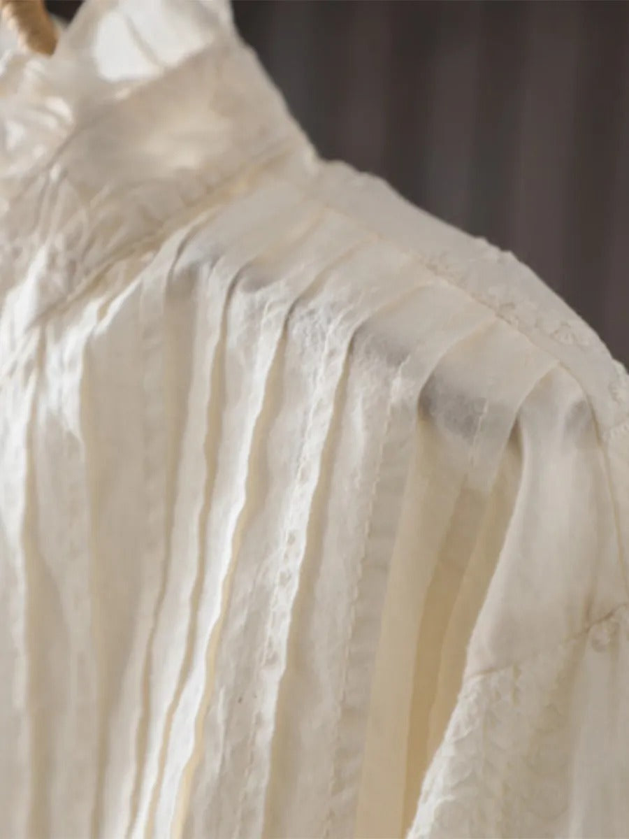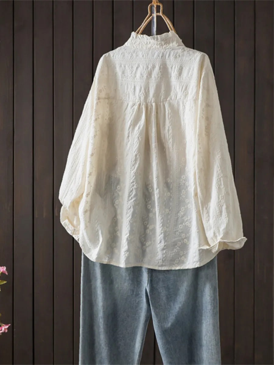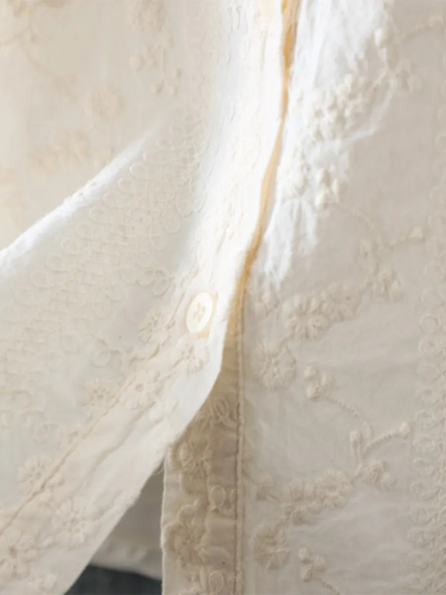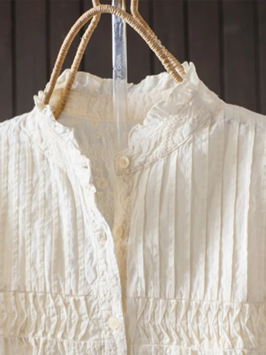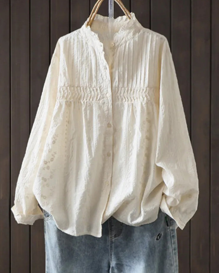 Nowa, luźna koszula w stylu francuskim z zakładkami harmonijkowymi, wykonana z czystej bawełny i ozdobiona haftowanym wzorem kwiatowym.