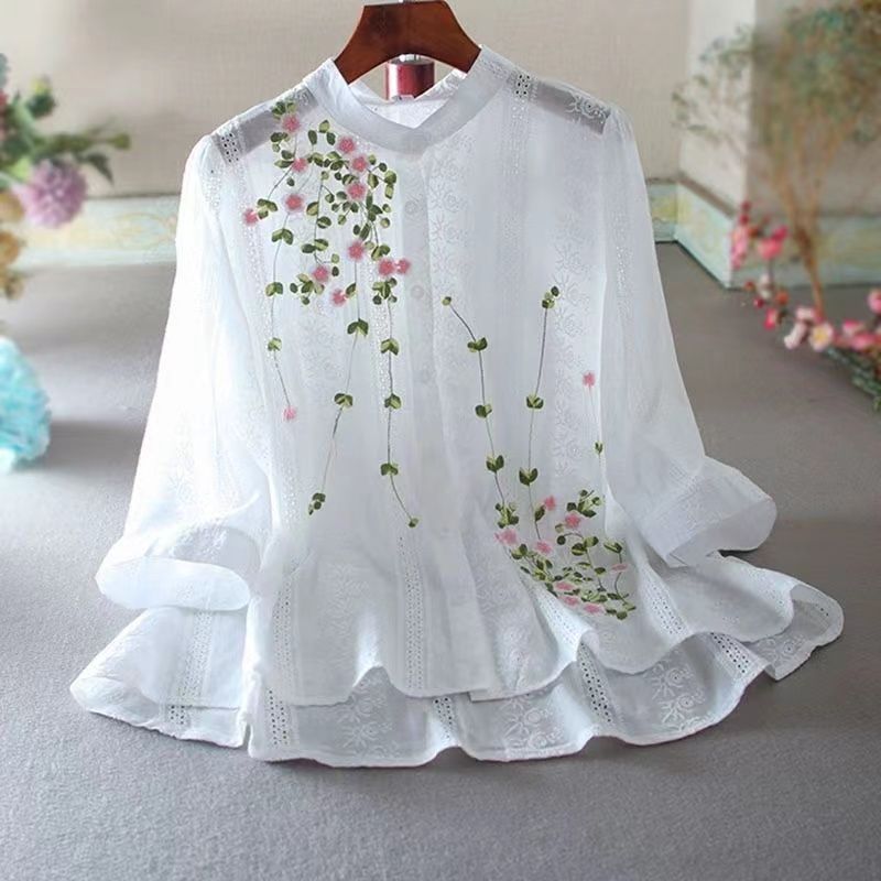 Świeża i elegancka koszula wykonana z czystej bawełny, ozdobiona pięknymi haftowanymi wzorami kwiatowymi.