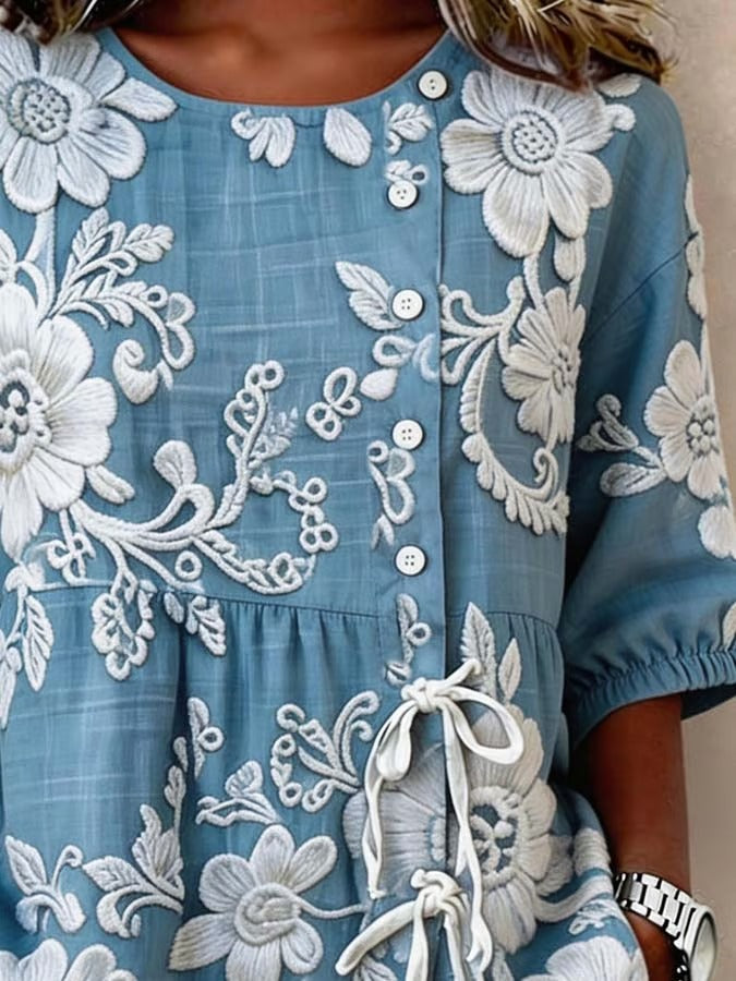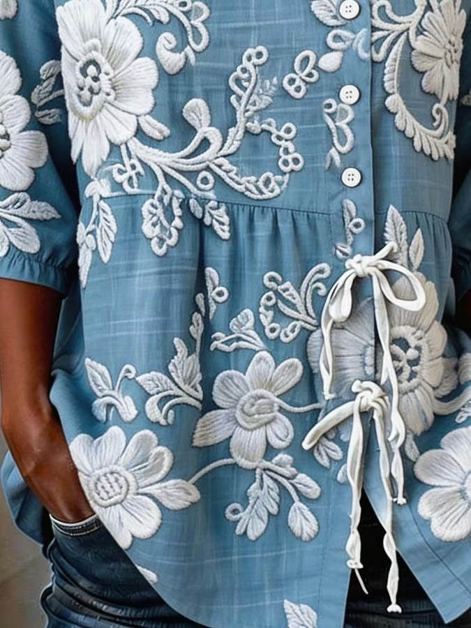 Ta damska koszula ma piękny nadruk, zapięcie na guziki i wiązanie. Jest luźna, wygodna, uniwersalna i praktyczna.