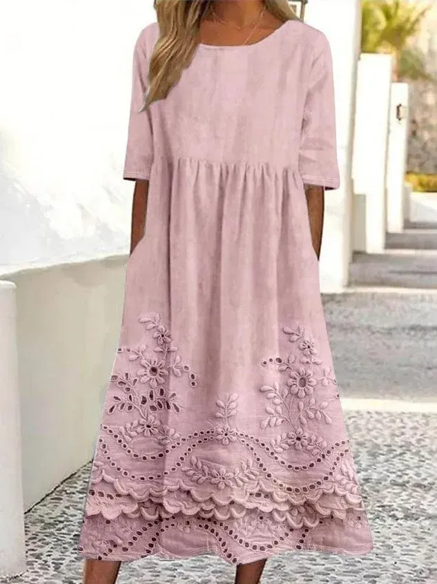 Ta luźna, wygodna różowa sukienka jest wykonana z mieszanki bawełny i lnu i ma prosty kwiatowy wzór.