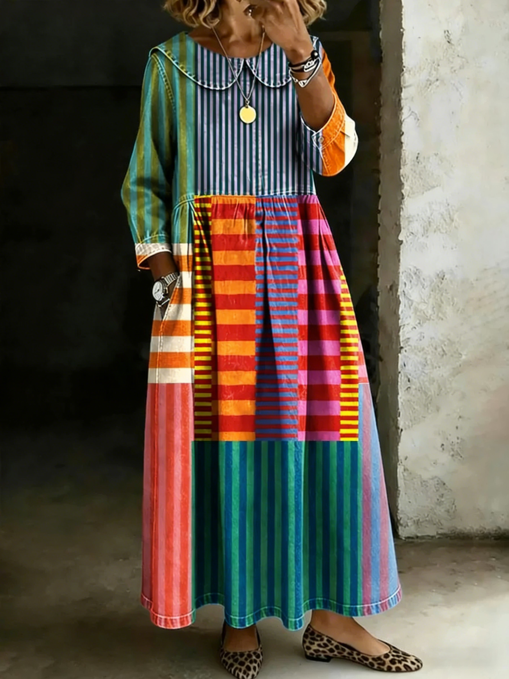 Ta luźna, wygodna sukienka jeansowa z kołnierzykiem została wykonana z mieszanki bawełny i lnu. Wyróżnia się kolorowym, nieregularnym, geometrycznym nadrukiem.
