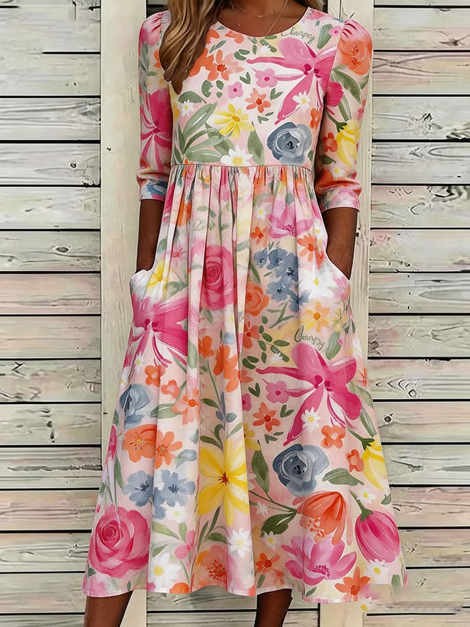 Ta luźna, wygodna sukienka w kolorze różowym, z nadrukiem, została uszyta z mieszanki bawełny i lnu.