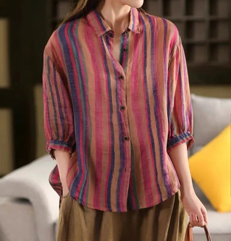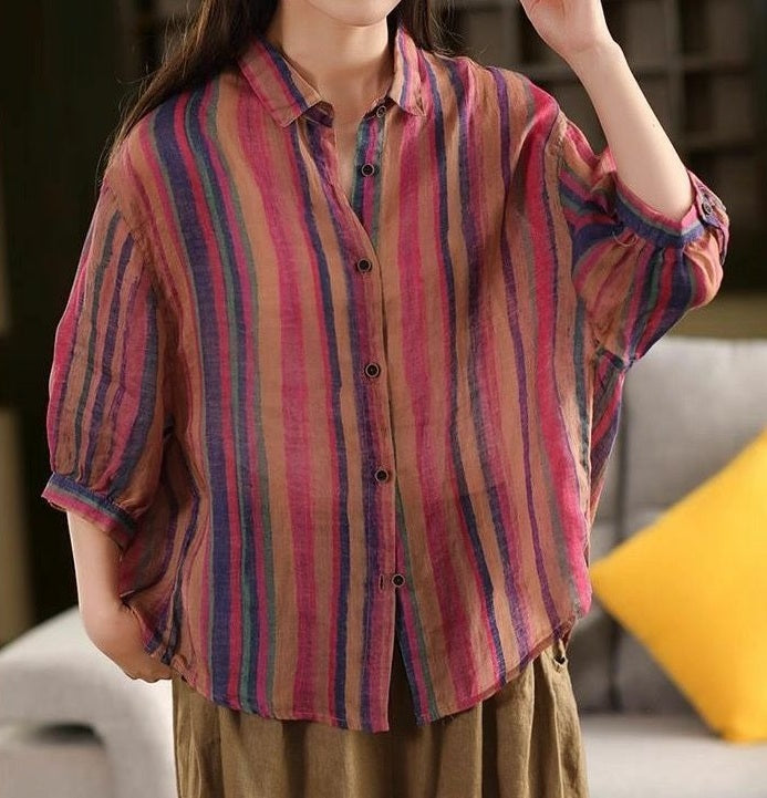 Wygodna damska koszula z rękawem 3/4, kolorowymi paskami, długimi rękawami i zapięciem na guziki